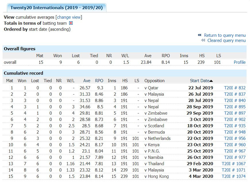 Singapore who played their first T20I versus Qatar in July 2019 have played 15 matches in all, winning 9 and losing 6. While their losses have mainly come against much stronger teams, such as Netherlands, Kenya and Zimbabwe, Singapore have generally ruled the roost against the likes of Qatar, Malaysia, Thailand and Hong Kong. They have even registered a maiden win against Zimbabwe. Their latest high ranking may have been helped by three wins on the trot in 2020 against Thailand, Malaysia and Hong Kong respectively. Take a look at Singapore’s T20I record in the following chart: