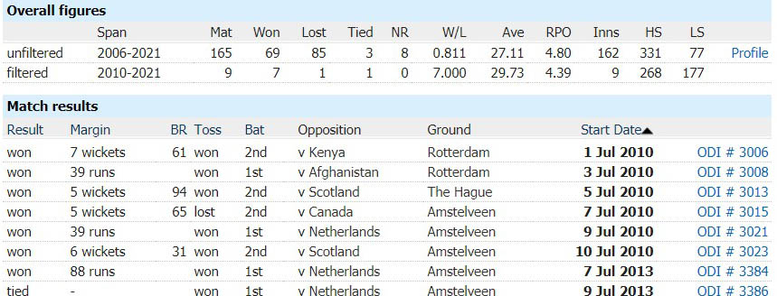 The head-to-head comparison between the sides is overwhelmingly in Ireland’s favour. In nine matches between the teams, Ireland have won 7 and lost just 1, with one match ending without result. The loss in the first ODI of the ongoing series was Ireland’s only defeat to Netherlands.